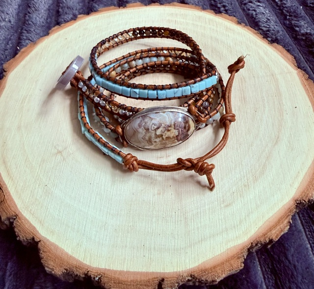 A Crazy Lace Agate, set in sterling silver, with Turquoise, Tiger Eye, and Jasper beads in the wrap band. The total wrap length is 37″, with button closures of 34″, 35″, or 36″; these measurements fit a maximum wrist circumference of 7″, comfortably. The Agate setting measures 7/8″ x 1 and 7/8″.